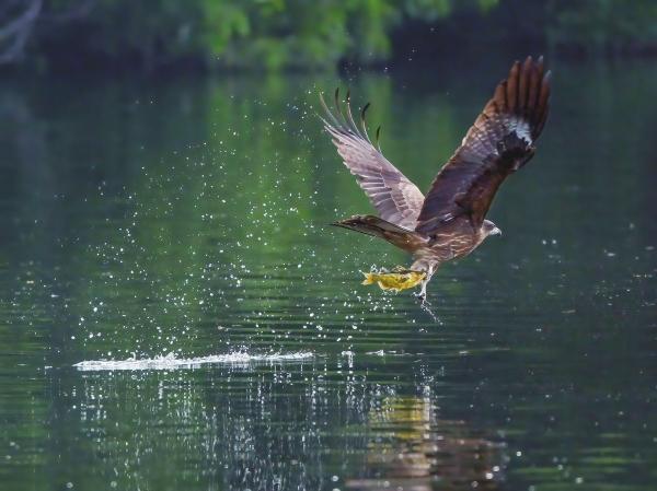 1月27日,長(zhǎng)沙市雨花區(qū)跳馬鎮(zhèn),國(guó)家二級(jí)保護(hù)動(dòng)物黑鳶在空中盤(pán)旋,發(fā)現(xiàn)魚(yú)浮出水面,迅速俯沖將其捕獲,然后帶到安全的地方享用。