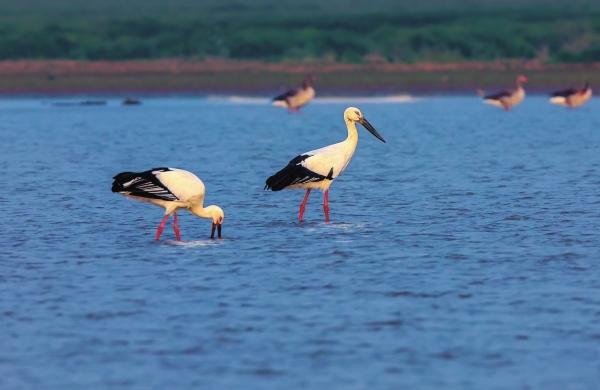 1月3日,岳陽(yáng)市君山區(qū)廣興洲鎮(zhèn),國(guó)家一級(jí)保護(hù)動(dòng)物東方白鸛在水中覓食。東方白鸛全球數(shù)量約9000只。