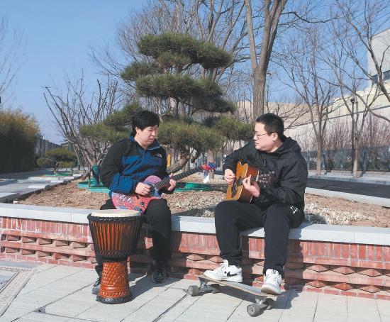 兩位音樂愛好者在臺湖舞美藝術中心口袋公園內彈奏樂器。聶堂明攝