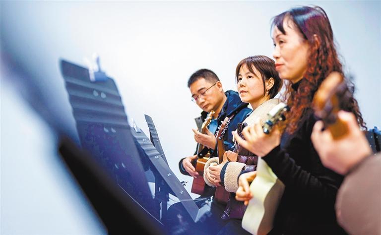 2月24日晚,浙江省湖州市長興縣工人文化宮,企業(yè)職工在學(xué)習(xí)演奏尤克里里。譚云俸 攝(中經(jīng)視覺)