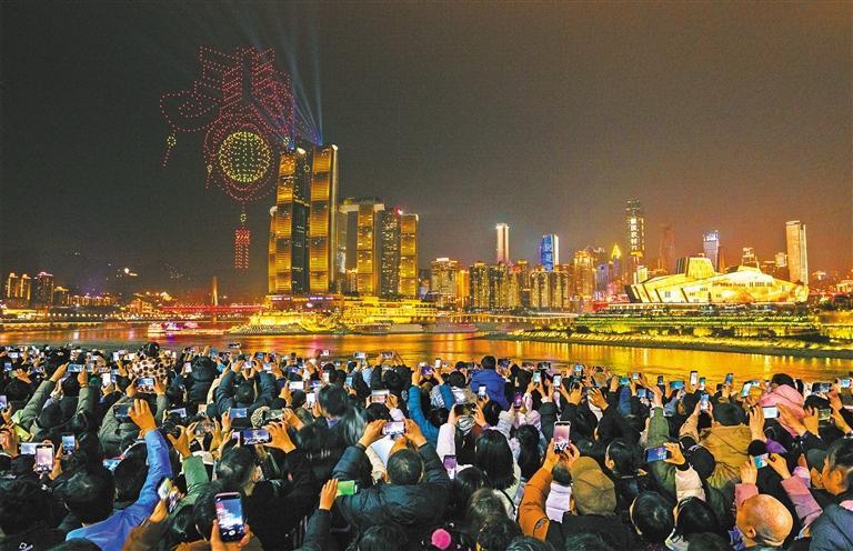 2月11日,重慶,市民在長江邊觀看無人機(jī)表演。重慶的“無人機(jī)燈光表演”將科技創(chuàng)新融入傳統(tǒng)節(jié)日,不僅呈現(xiàn)出視覺盛宴,也為假日消費(fèi)增添了新動能。劉嵩 攝(中經(jīng)視覺)