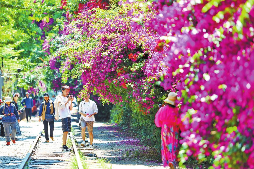 5月,昆明市五華區(qū)地臺(tái)寺鐵路兩側(cè)的三角梅絢爛綻放。在米軌鐵路旁、街巷轉(zhuǎn)角處,火紅的花瀑與周圍景物相映成趣,構(gòu)成了一幅充滿詩(shī)意的城市畫卷。(記者 高吳雙 攝)