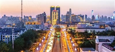 夜幕降臨,天津市友誼路沿線燈火璀璨,水晶宮飯店、津誼橋、蓮花酒店等地標(biāo)建筑披上絢麗的光影外衣。