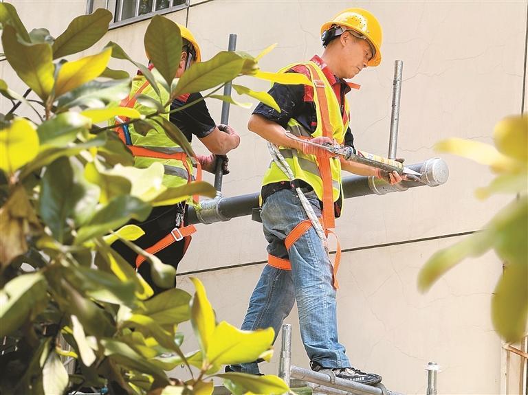 為盡可能減少施工對(duì)居民生活的影響,改造采用“微創(chuàng)手術(shù)式”作業(yè)。施工現(xiàn)場(chǎng),一組工作人員正在備料場(chǎng)內(nèi)按尺寸切割管道,另一組工作人員已在腳手架上安裝新管道。