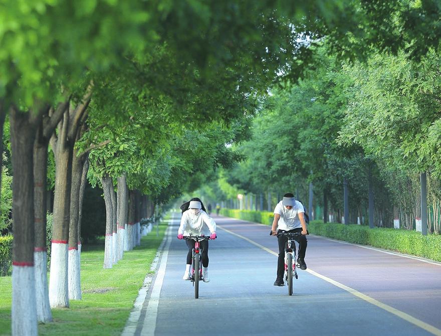 6月22日,太原濱河自行車專用道碧樹成蔭,市民騎行穿梭其間,盡享愜意時光,成為夏日里亮麗的城市風景線。記者 王瑞瑞 攝