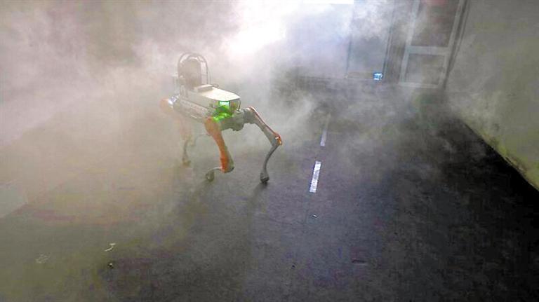 四足機(jī)器人在煙霧中開(kāi)展搜救,將現(xiàn)場(chǎng)情況實(shí)時(shí)向指揮部進(jìn)行圖傳。深圳市消防救援支隊(duì)供圖