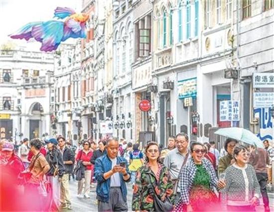 海南省??谑写蛟焯厣幕放疲T樓老街經(jīng)過(guò)改造升級(jí),成為休閑娛樂(lè)好去處。圖為游客在騎樓老街游玩??档橇軘z(人民視覺(jué))