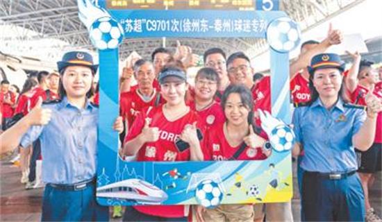 江蘇省城市足球聯(lián)賽(“蘇超”)期間,多部門(mén)提供“球迷專(zhuān)列”等便民服務(wù)。城市用精細(xì)服務(wù)傳遞文明理念,市民用高素質(zhì)行為反哺城市形象。圖為球迷乘坐C9701次專(zhuān)列到達(dá)泰州站后留影。湯德宏攝(影像中國(guó))