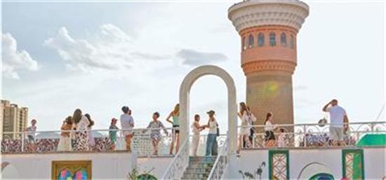 游客在新疆維吾爾自治區(qū)烏魯木齊市新疆國(guó)際大巴扎景區(qū)拍照。該景區(qū)匯聚了新疆各地特色商品、美食和民俗文化表演。孫振嵩攝(影像中國(guó))