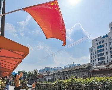 7架殲-10表演機(jī)劃出14道彩煙,市民在紅旗下打卡拍攝。喬健 攝