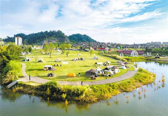 秋日的黎香湖鎮(zhèn)濕地生態(tài)園,露營區(qū)大片的綠色草坪上,各式帳篷星羅棋布,游客們在此享受大自然的寧靜與愜意。