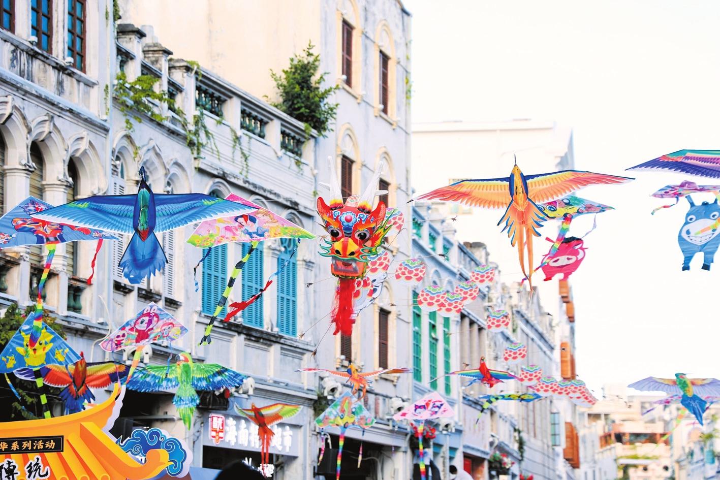近日,“中國傳統(tǒng)風(fēng)箏文化展”走進(jìn)??隍T樓老街。圖為各具特色的風(fēng)箏“飛舞”,吸引市民游客駐足欣賞。(組委會供圖)