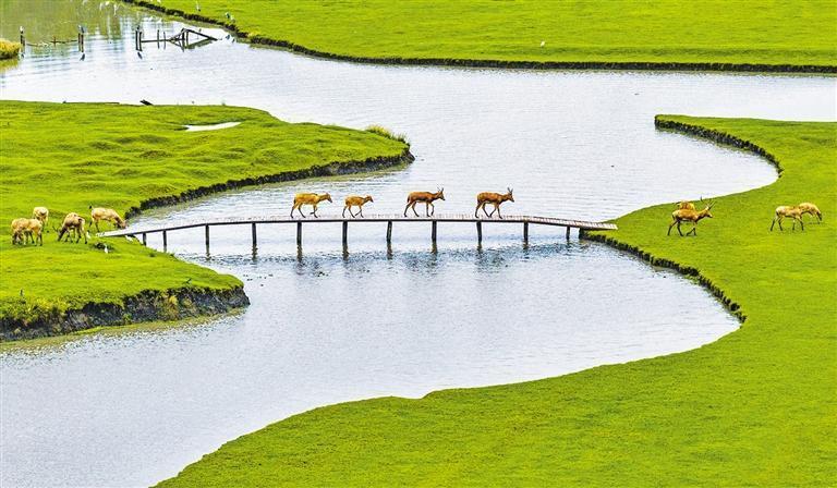 10月17日,江蘇省泰州市姜堰區(qū)溱湖國(guó)家濕地公園內(nèi),麋鹿漫步,生態(tài)和諧,景美如畫。周社根攝(中經(jīng)視覺)