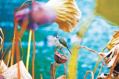 什剎海西海,一只麻雀棲息在殘荷之上,在寒風(fēng)中縮緊身子。楊一良 攝