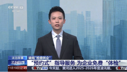 11月19日中午,CCTV13《法治在線》播出浙江省寧波市縱深推進“大綜合一體化”行政執(zhí)法改革工作,優(yōu)化營商環(huán)境,規(guī)范涉企行政檢查,加強行政檢查計劃統(tǒng)籌情況,報道了寧波市鎮(zhèn)海區(qū)九龍湖鎮(zhèn)“預(yù)約式”指導(dǎo)服務(wù)為企業(yè)免費“體檢”的典型做法。