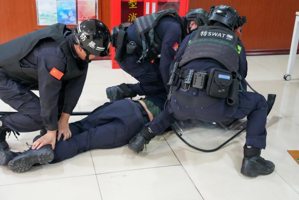 實(shí)戰(zhàn)模擬環(huán)節(jié)以“商業(yè)中心發(fā)生個(gè)人極端事件”為預(yù)設(shè)場景,全程模擬真實(shí)應(yīng)急處置流程。安保人員第一時(shí)間通過可視對講機(jī)報(bào)警,派出所指揮中心接報(bào)后,迅速開展應(yīng)急調(diào)度,指揮該商業(yè)中心的物業(yè)保安組成“最小應(yīng)急單元”,率先趕到現(xiàn)場展開先期處置。與此同時(shí),啟動(dòng)“就近互助”聯(lián)防機(jī)制——鄰近商圈、步行街的物業(yè)安保力量在接到指令后,快速攜帶裝備奔赴現(xiàn)場增援。巡特警大隊(duì)PTU則在最短時(shí)間內(nèi)抵達(dá),以專業(yè)的戰(zhàn)術(shù)素養(yǎng)與現(xiàn)場處置力量協(xié)同配合,高效穩(wěn)妥地處置了模擬警情。派出所民警同步完成接處警后續(xù)工作,實(shí)現(xiàn)了從報(bào)警到處置完畢的全流程閉環(huán)。整個(gè)處置過程緊張有序,有效檢驗(yàn)了最小應(yīng)急單元的快速反應(yīng)與協(xié)同作戰(zhàn)能力。