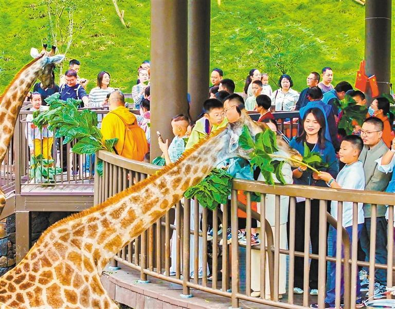 5月1日,游客在清江灣旅游度假區(qū)的三峽長(zhǎng)頸鹿樂(lè)園與長(zhǎng)頸鹿互動(dòng)。劉傳東攝(中經(jīng)視覺(jué))