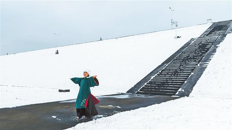 1月1日,光山縣潑河水庫(kù),瑞雪覆蓋了堤壩,游客身著漢服在雪中拍照,盡顯韻味。晏榮榮攝