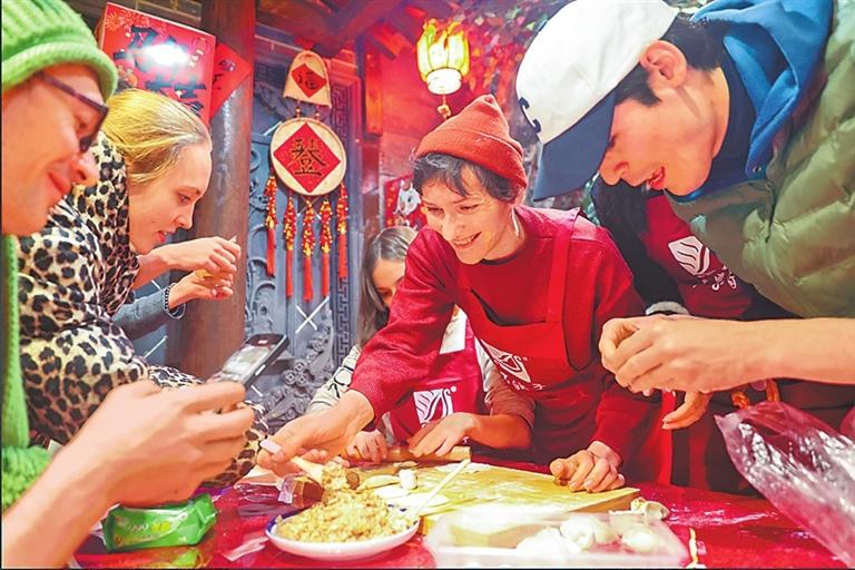 1月1日,三門峽市一家酒店內(nèi),來(lái)自俄羅斯的游客在專業(yè)廚師的指導(dǎo)下,體驗(yàn)中國(guó)傳統(tǒng)美食餃子的制作過(guò)程。孫猛攝