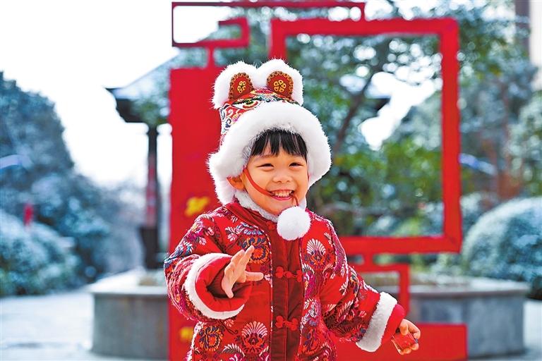 1月1日,在商丘市夏邑縣一居民小區(qū),頭戴虎頭帽、身穿傳統(tǒng)服裝的孩子在玩耍。苗育才攝