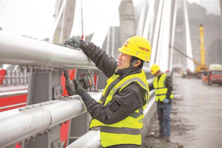 1月1日,工人在修文縣境內(nèi)的烏長高速公路金旗特大橋項目建設(shè)現(xiàn)場有序作業(yè)。 袁福洪 攝 (影像貴州)