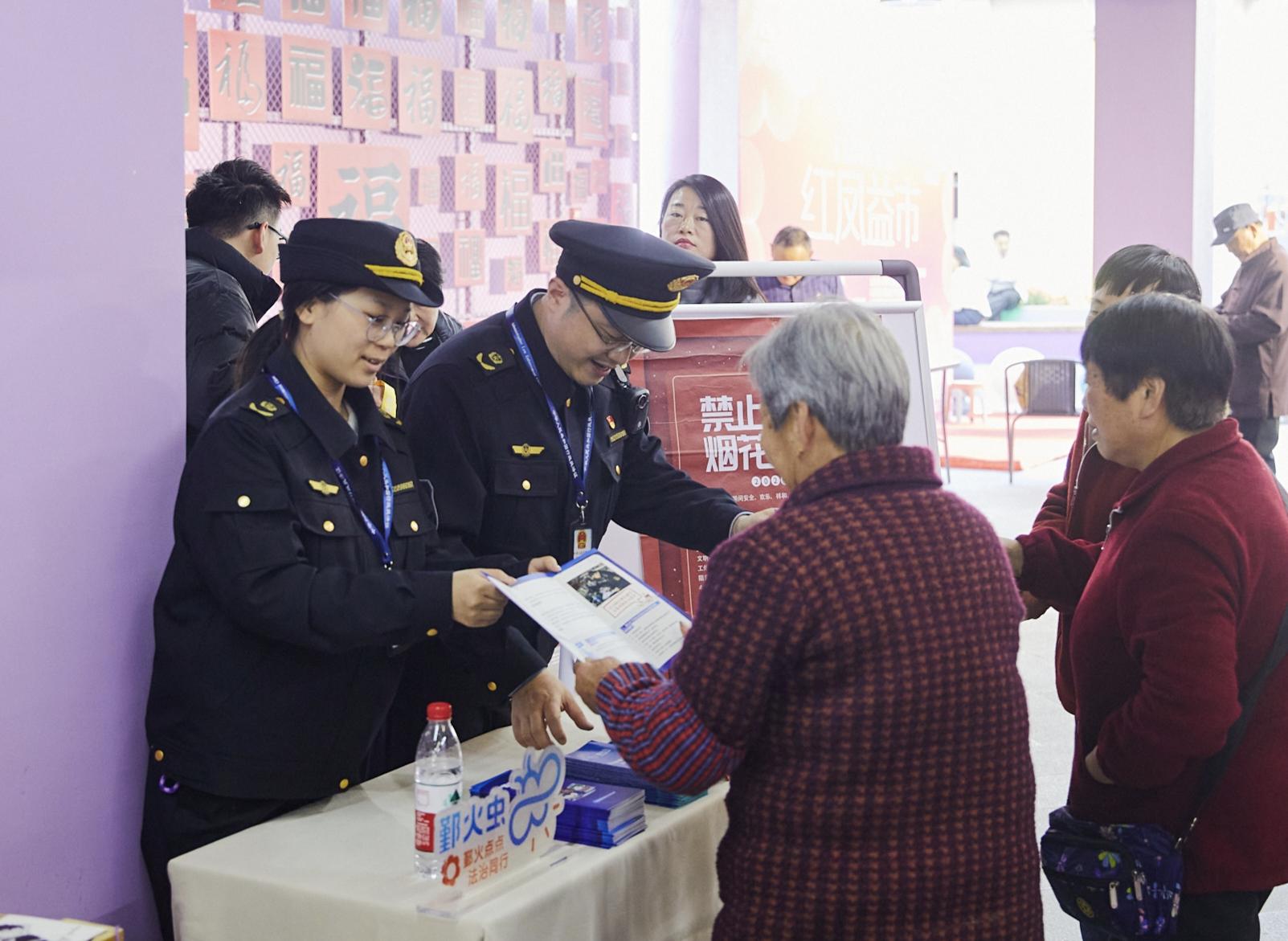 圖為執(zhí)法人員為過(guò)往群眾發(fā)放煙花爆竹安全宣傳資料