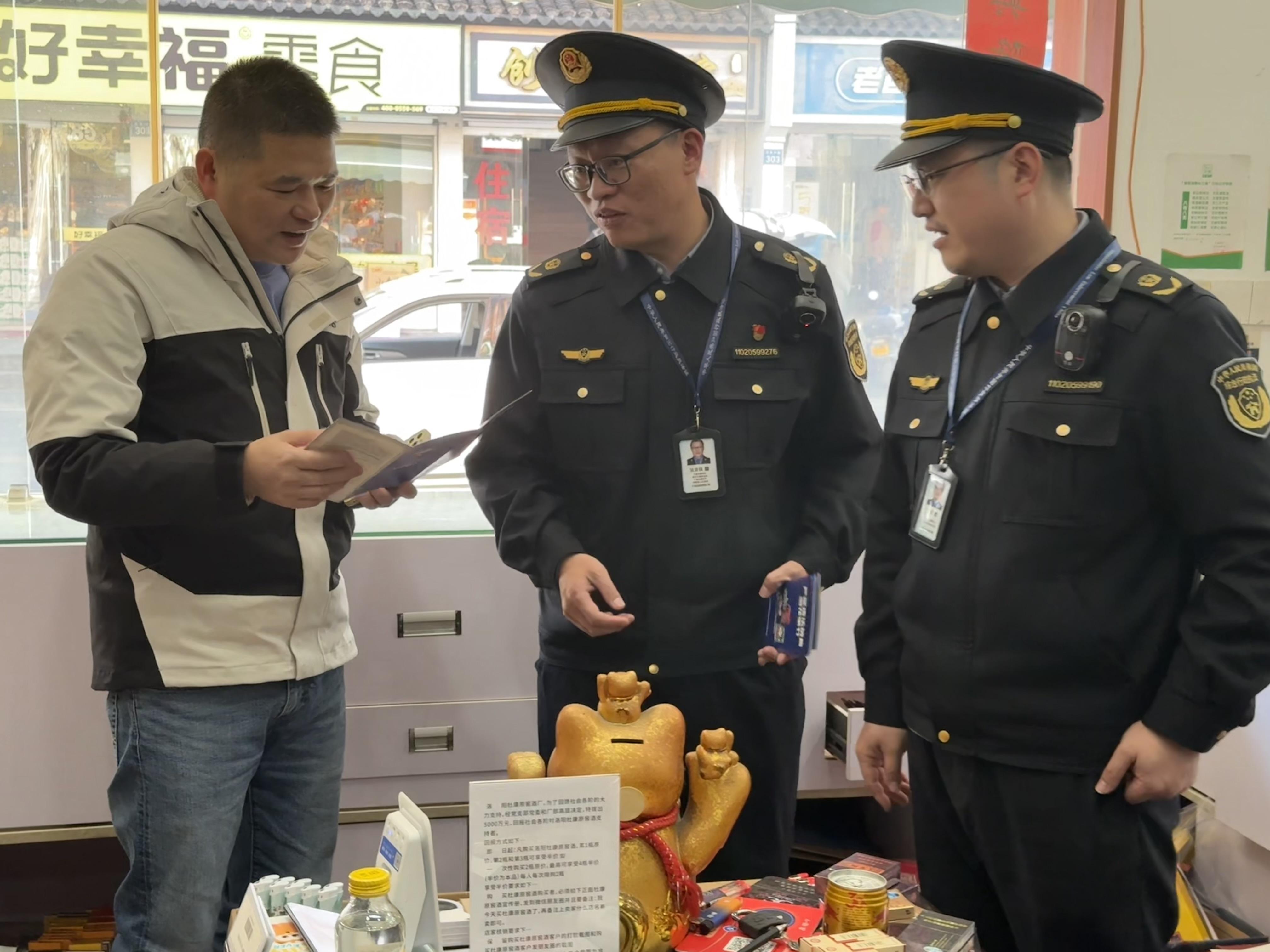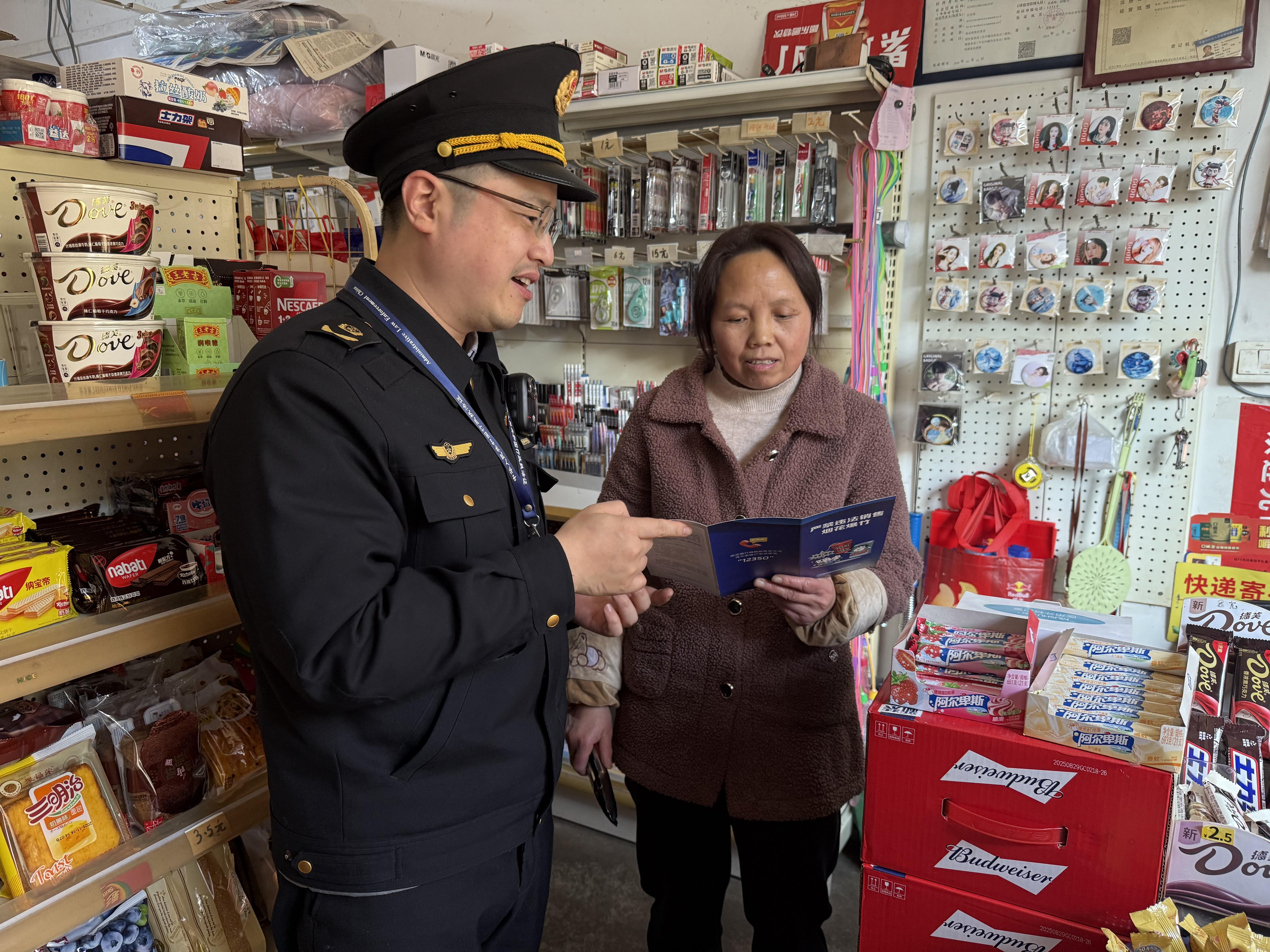 圖為執(zhí)法人員在便利店進(jìn)行檢查并宣傳