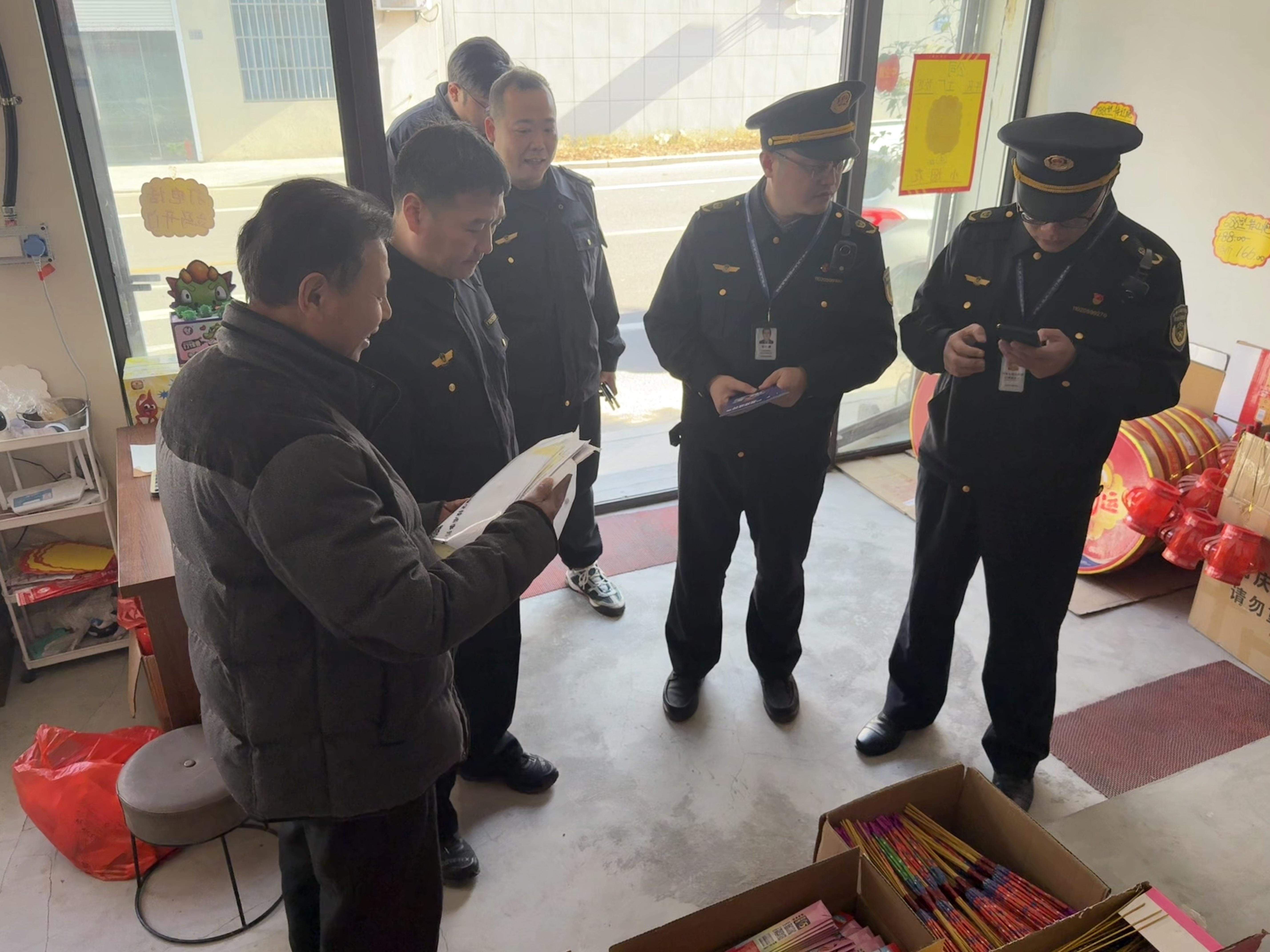 圖為執(zhí)法人員在煙花爆竹零售店和學(xué)校周邊的店鋪進(jìn)行檢查并宣傳