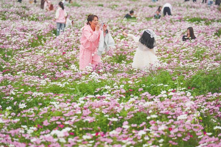 1月30日,位于??诿捞m區(qū)瓊山大道的海南國際花卉產(chǎn)業(yè)園,大片格桑花迎冬綻放。色彩繽紛的格桑花海,吸引眾多市民游客前來打卡拍照。記者 李天平 攝