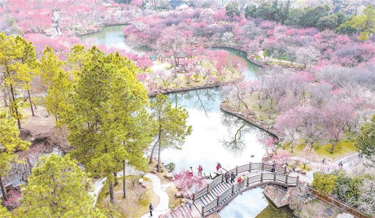 2月25日,游客在江蘇揚州瘦西湖風景區(qū)賞梅游玩(無人機照片)。春意漸濃,各地美景吸引人們外出游玩賞景,盡享春日好時光。 新華社發(fā)