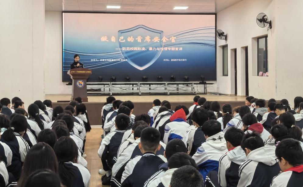 為進一步筑牢校園安全防線,切實增強未成年人法治意識和自我保護能力,3月9日,湖南省湘潭市湘鋼一中教育集團七中校區(qū)邀請湘潭市公安局岳塘分局板塘派出所民警張雨茜進校園,開展以“做自己的首席安全官”為主題的法治安全宣講活動?;顒泳劢狗婪缎@欺凌、暴力侵害及性侵害等重點內(nèi)容,從源頭上預(yù)防和減少侵害未成年人案件發(fā)生。