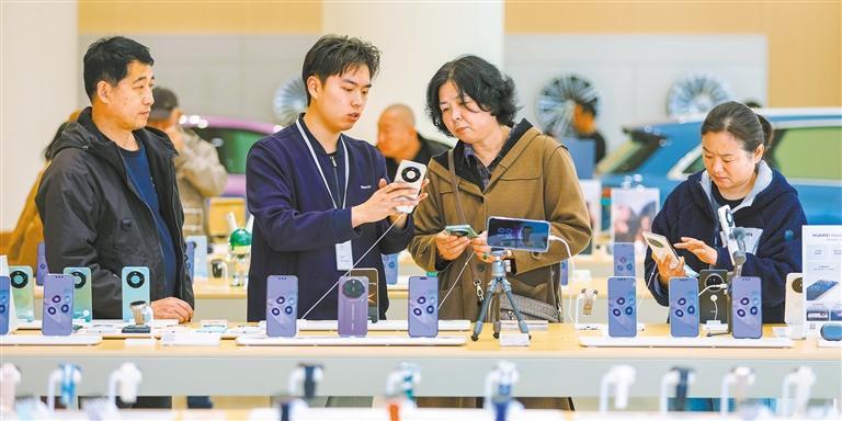 3月25日,山東省青島市樂客城華為智能生活館,消費者在選購手機等“國補”產(chǎn)品。張鷹 攝(中經(jīng)視覺)