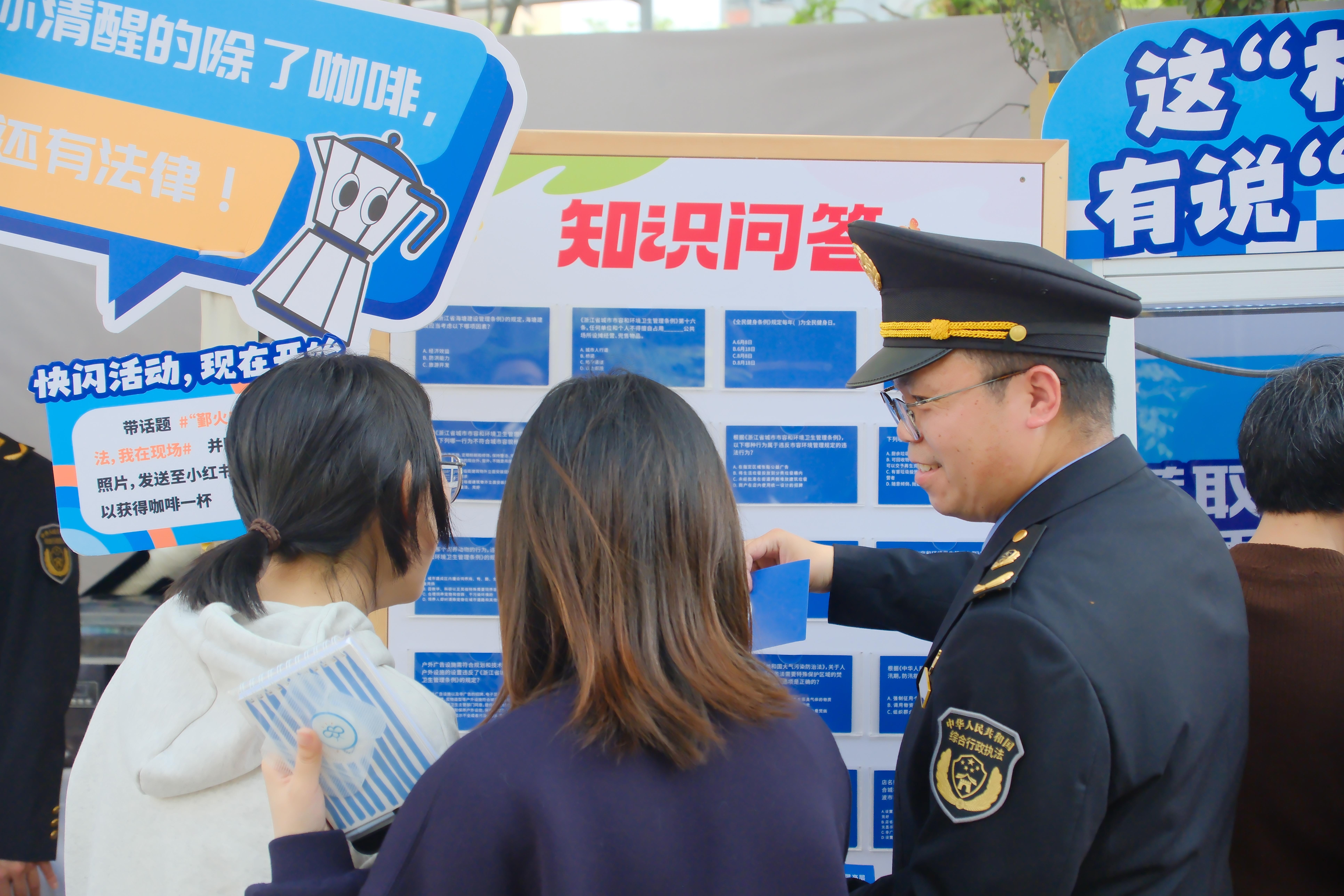 啟動(dòng)儀式后,東勝中隊(duì)打造的普法主題攤位迅速成為市集里的“人氣打卡點(diǎn)”?;顒?dòng)深度融合“鄞火蟲(chóng)”法治服務(wù)品牌惠民理念,執(zhí)法人員化身“普法攤主”,聚焦《寧波市養(yǎng)犬管理?xiàng)l例》《浙江省生活垃圾管理?xiàng)l例》等與群眾生活密切相關(guān)的法律法規(guī),精心推出“答題贏幣、互動(dòng)抽獎(jiǎng)”環(huán)節(jié)。市民通過(guò)參與法律知識(shí)問(wèn)答贏得娃娃機(jī)游戲幣,再通過(guò)抓取的娃娃兌換法治主題咖啡杯、普法文創(chuàng)等禮品。這種寓學(xué)于樂(lè)的方式,讓嚴(yán)肅的法條變得通俗易懂,讓法治宣傳更具吸引力,不少市民紛紛點(diǎn)贊:“逛咖啡節(jié)還能學(xué)法領(lǐng)禮品,這樣的普法形式接地氣、受歡迎!”