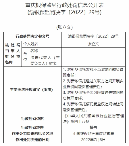 張立文對新華信托發(fā)放不當(dāng)激勵(lì)問題負(fù)管理責(zé)任、對新華信托通過關(guān)聯(lián)方違規(guī)開展實(shí)業(yè)投資問題負(fù)管理責(zé)任、對新華信托全面風(fēng)險(xiǎn)管理失效問題負(fù)管理責(zé)任、對新華信托信托受益權(quán)違規(guī)轉(zhuǎn)讓問題負(fù)管理責(zé)任。依據(jù)《中華人民共和國銀行業(yè)監(jiān)督管理法》第四十八條,中國銀保監(jiān)會重慶監(jiān)管局對其警告。