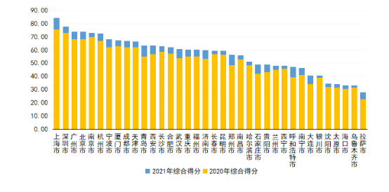 評估顯示,2021年度各參評城市綜合得分均值為56.53,比上次評估得分均值(51.63)增長9.49%。所有參評城市綜合得分較上次均有所提升,超過5%的城市有33個,占比達91.67%;超過10%的城市有12個,占比達33.33%。