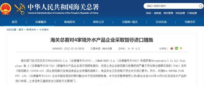 海關(guān)總署網(wǎng)站10月26日消息,海關(guān)部門在對(duì)厄瓜多爾FRIGOPESCA C.A.(注冊(cè)編號(hào)為3976)、CAMAR-EXPO S.A.(注冊(cè)編號(hào)為7863)和俄羅斯Oktyabrskiy-1 Co LLC fish plant № 2(注冊(cè)編號(hào)為CH-734)3家輸華水產(chǎn)品企業(yè)進(jìn)行視頻檢查時(shí),發(fā)現(xiàn)上述企業(yè)新冠肺炎疫情防控嚴(yán)重不符合聯(lián)合國(guó)糧農(nóng)組織(FAO)發(fā)布《新冠肺炎(COVID-19):防止新冠肺炎在食品食品企業(yè)傳播的指南》,食品安全衛(wèi)生控制不符合中方進(jìn)口要求;另外,印度M/s RUPSHA FISH PVT. LTD.(注冊(cè)編號(hào)為1319)企業(yè)未能在規(guī)定時(shí)限內(nèi)配合中方完成視頻檢查。中方?jīng)Q定暫停接受上述4家企業(yè)自2022年10月26日后啟運(yùn)水產(chǎn)品的進(jìn)口申報(bào)。上述信息已通報(bào)各出口國(guó)官方主管部門。(汪定強(qiáng))