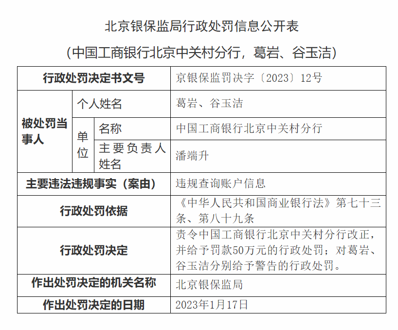 1月28日,北京銀保監(jiān)局行政處罰信息公開表顯示,中國工商銀行北京中關(guān)村分行主要違法違規(guī)事實為,違規(guī)查詢賬戶信息。2023年1月17日,北京銀保監(jiān)局責令中國工商銀行北京中關(guān)村分行改正,并給予罰款50萬元的行政處罰;對葛巖、谷玉潔分別給予警告的行政處罰。
