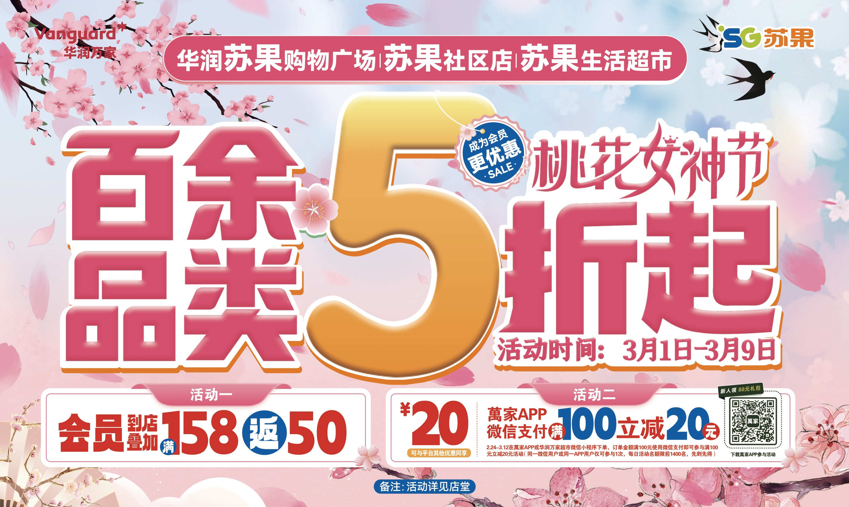 據(jù)了解,華潤蘇果針對女神節(jié)推出5折至8.5折的大力度折扣,涵蓋百貨、日化、食品、日配、生鮮等眾多商品。如成人牙刷、洗衣凝珠、毛巾、服裝等5折;洗護(hù)發(fā)、沐浴露、成人牙膏、洗手液、衛(wèi)生巾、抽紙、床上用品、內(nèi)衣褲等6折;洗衣液、洗衣粉、紙尿褲等6.5折;食醋、料酒、麻油、醬油等6.9折;雜糧、南北干貨、火鍋底料、啤酒、洋酒、護(hù)膚品、一次性餐具、頭發(fā)造型、寵物食品等7折;預(yù)制菜、掛面、鍋具、潔廁用品等7.5折;常溫牛奶、低溫酸奶、孕嬰奶粉、方便面、冷凍水餃、碳酸飲料等8折;雞精、味精、糕團(tuán)等8.5折。