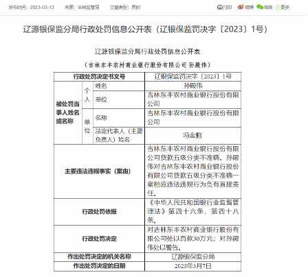 中國網(wǎng)財經(jīng)3月13日訊 今日,銀保監(jiān)會網(wǎng)站顯示,吉林東豐農(nóng)村商業(yè)銀行因貸款五級分類不準(zhǔn)確,被遼源銀保監(jiān)分局罰款30萬元。