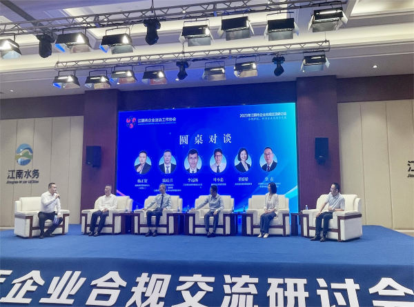 在合規(guī)主題圓桌對談環(huán)節(jié),賽尼爾法務(wù)智庫總裁葉小忠、北京金杜律所高級顧問董嬌嬌、江南水務(wù)副總經(jīng)理陸慶喜、江蘇泰和律所管委會主任李遠(yuǎn)揚(yáng)、江陰市企業(yè)法治工作協(xié)會會長蔡磊五位嘉賓,分別立足各自領(lǐng)域,圍繞會議主題深入探討,交流思想、分享經(jīng)驗(yàn)。