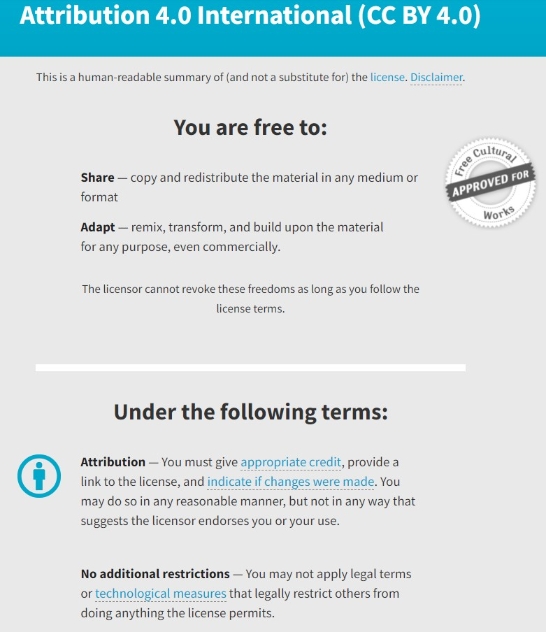 知識(shí)共享署名4.0國(guó)際許可協(xié)議,允許使用者用于商業(yè)用途,但不得應(yīng)用法律條款或技術(shù)措施來合法限制他人執(zhí)行許可證允許的任何操作。 截圖自CC官網(wǎng)。