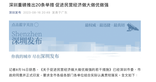 近期,各地促進(jìn)民營(yíng)經(jīng)濟(jì)發(fā)展的政策舉措密集出臺(tái),深圳也密集推出系列政策舉措。8月7日,深圳三大優(yōu)化營(yíng)商環(huán)境工作方案正式發(fā)布,立足于市場(chǎng)化、法治化、國(guó)際化加快營(yíng)造一流營(yíng)商環(huán)境。據(jù)深圳發(fā)布16日消息,《關(guān)于促進(jìn)民營(yíng)經(jīng)濟(jì)做大做優(yōu)做強(qiáng)的若干措施》(下稱《若干措施》)已經(jīng)深圳市委、市政府同意并正式印發(fā),提出20項(xiàng)舉措,加速釋放民營(yíng)企業(yè)發(fā)展動(dòng)能。