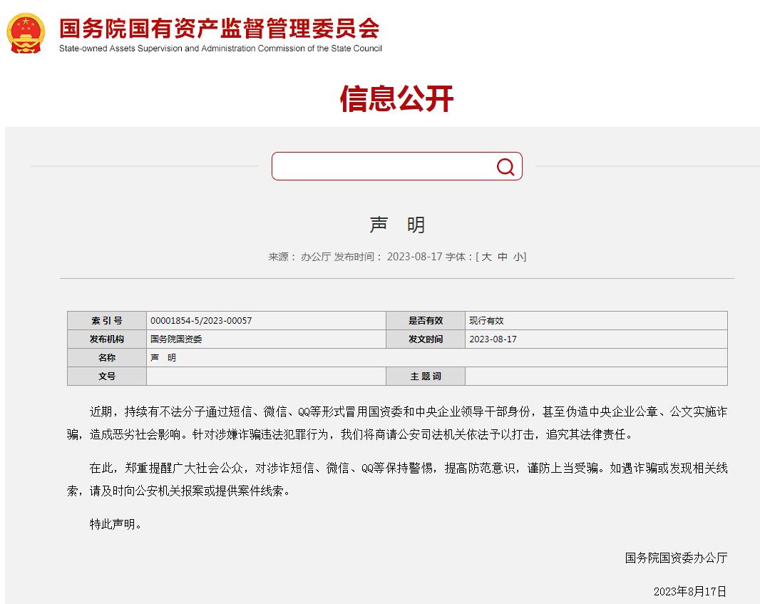 國務院國有資產(chǎn)監(jiān)督管理委員會網(wǎng)站8月17日發(fā)布的聲明內(nèi)容截圖