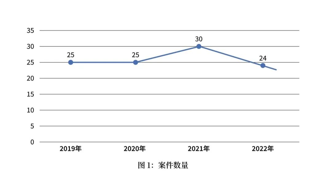 我院于2019年1月1日至2022年12月31日審結(jié)的涉股東出資責任案件,去除管轄、財保、指令審理,有效案件共計104件,包括一審案件3件,二審案件100件,再審案件1件。從結(jié)案年份來看,2019年為25件,2020年為25件,2021年為30件,2022年為24件。2019年至2021年逐年增加,2021年出現(xiàn)峰值,受新冠疫情等因素影響,2022年結(jié)案數(shù)量有所回落。從以上數(shù)字可見,我院審結(jié)的涉股東出資責任案件數(shù)量總體呈平穩(wěn)上升趨勢。(如圖1)