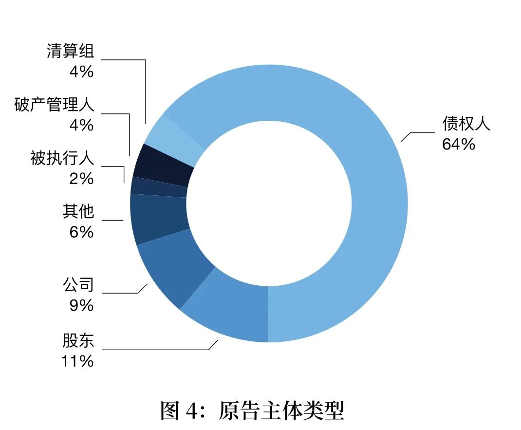 我院近四年審理的涉股東出資責任案件中,原告的主體范圍包括公司、股東、債權(quán)人、清算組、破產(chǎn)管理人、被執(zhí)行人等,其中債權(quán)人作為原告的案件數(shù)量占比64%,是要求股東承擔出資責任的主要群體,占據(jù)絕對多數(shù)。被告的主體范圍包括公司、違反出資義務(wù)的股東、受讓股東、出資未屆期的股東、協(xié)助抽逃出資董事、高級管理人員、瑕疵股權(quán)的受讓人等,其中違反出資義務(wù)的股東與出資未屆期的股東作為被告的案件數(shù)量占比56%,也超過了半數(shù)。綜合原被告的主體范圍數(shù)據(jù),可以發(fā)現(xiàn)我院近四年審理的涉股東出資責任案件中,大部分系債權(quán)人要求違反出資義務(wù)的股東與出資未屆期的股東承擔出資責任的案件。(如圖4、圖5)
