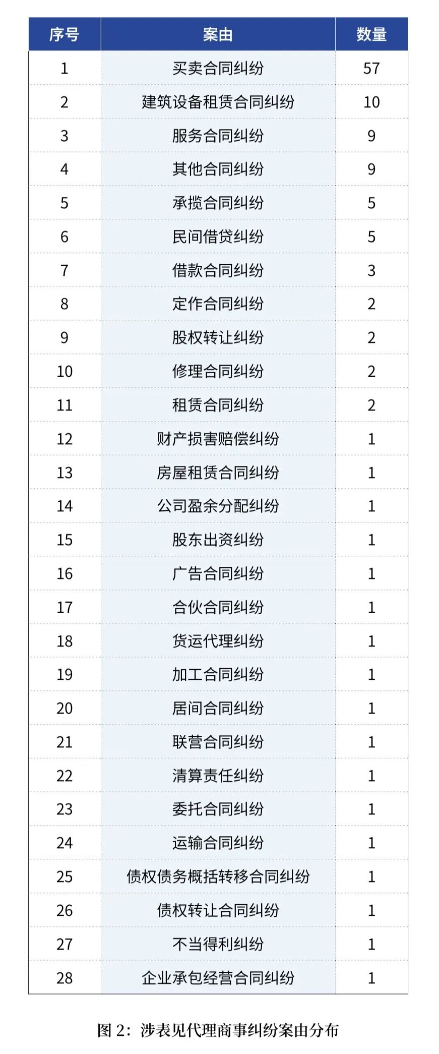 2019年至2022年審結(jié)的涉表見代理商事糾紛案件共涉及28個案由,其中買賣合同糾紛案件為57件,占比46.34%,接近總數(shù)量的一半;建筑設(shè)備租賃合同糾紛案件為10件,占比8.13%;服務(wù)合同糾紛案件、其他合同糾紛案件各為9件,分別占比7.32%,此四類合同,分別占結(jié)案數(shù)的前三位。(如圖2)