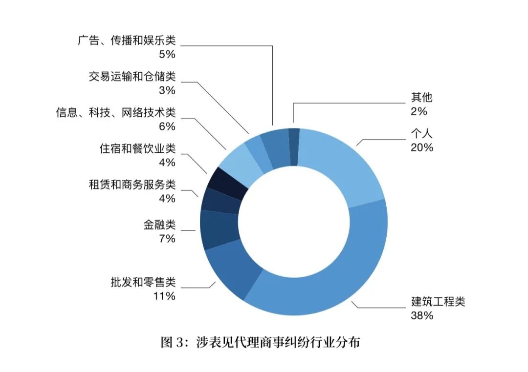 123件涉表見代理商事糾紛案件中,涉訴主體共有327名,其中公司為260家,占79.51%,個人為67人,占20.49%。在260家公司中,根據(jù)行業(yè)分類,建筑工程類有125家,批發(fā)和零售類有36家,金融類有22家,信息、科技、網(wǎng)絡(luò)技術(shù)類有19家,住宿和餐飲業(yè)有22家,信息傳輸、信息技術(shù)服務(wù)業(yè)有18家,租賃和商務(wù)服務(wù)有14家,建筑業(yè)有12家,交通運(yùn)輸、倉儲業(yè)有9家,娛樂業(yè)有6家,其他行業(yè)有6家。(如圖3)
