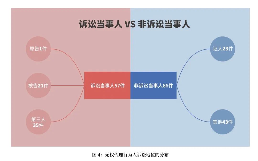 123件涉表見代理商事糾紛案件中,有57件將行為人列為訴訟當(dāng)事人,有66件未將行為人列為訴訟當(dāng)事人。在57件將行為人列為當(dāng)事人的案件中,行為人訴訟地位為原告的有1件,訴訟地位為被告的有21件,訴訟地位為第三人的有35件。在66件未將行為人列為當(dāng)事人的案件中,行為人作為證人出庭作證的有23件。(如圖4)