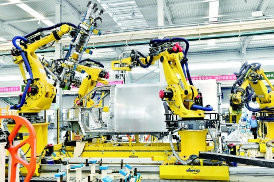 在山東鄒平魏橋輕量化基地宏奧全鋁車身集成生產(chǎn)車間,工業(yè)機器人在流水線上作業(yè) 新華社 圖