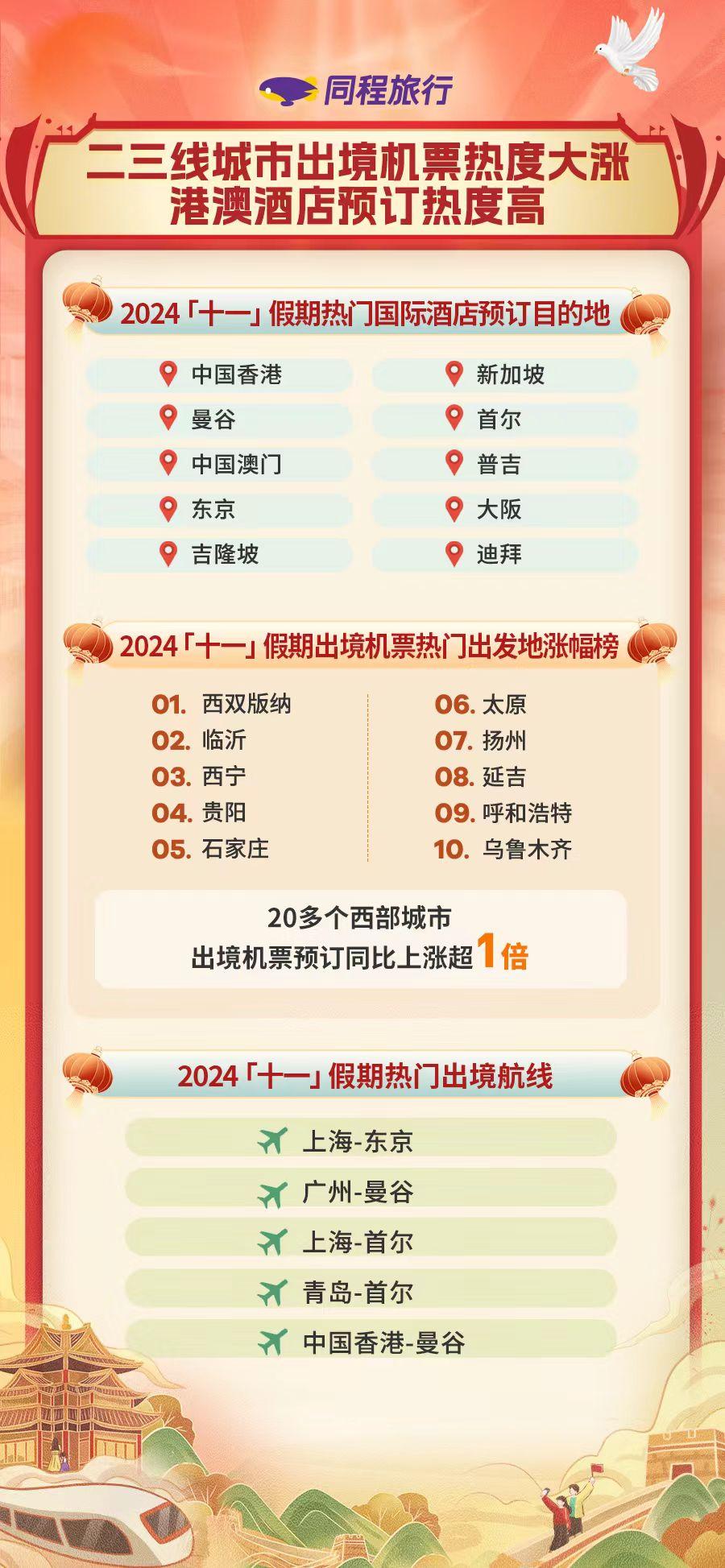 在客源地方面,國內(nèi)二三線城市居民特別是西部各省區(qū)市居民出境游需求快速增長。同程旅行數(shù)據(jù)顯示,今年“十一”假期出境游機(jī)票出發(fā)地中,西雙版納、臨沂、西寧、貴陽、石家莊等城市出境航班預(yù)訂熱度漲幅最高。有20多個西部城市出境機(jī)票預(yù)訂同比漲幅超過1倍。